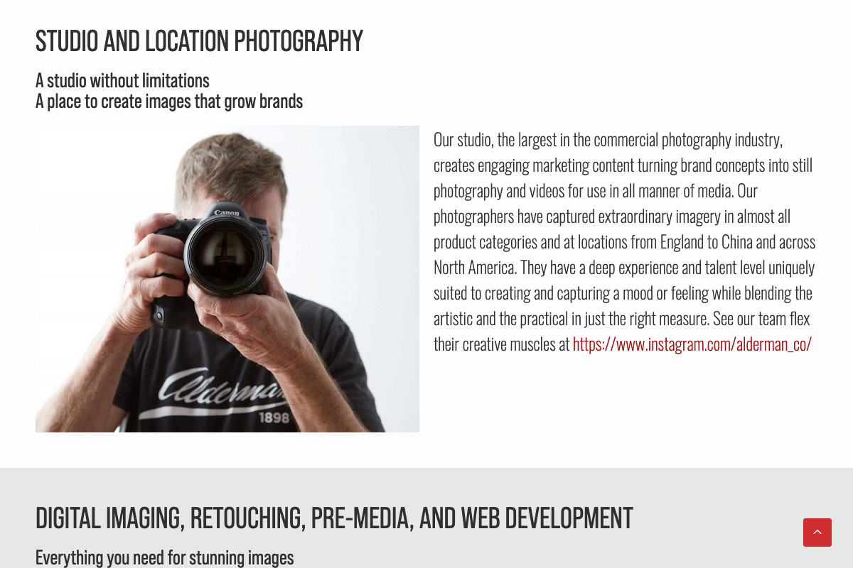 As Alderman Company’s in-house website developer I was in charge of creating a new company portfolio website. Working with talented designers and photographers I took their vision to help advertise the company’s vision.