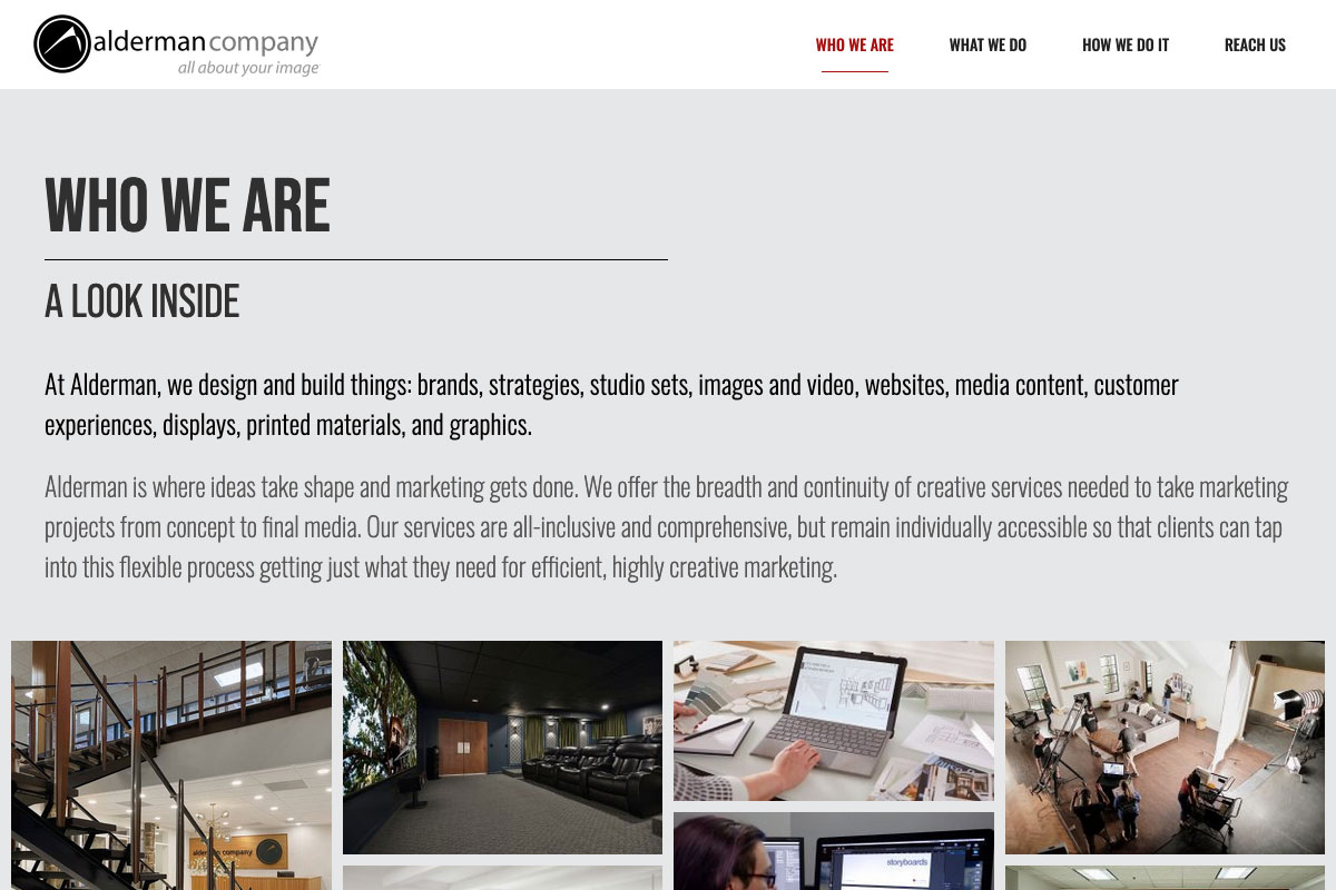 The Alderman Company, designs and build things. Brands, images, studio sets, websites, brochures, customer experiences, strategies, displays, catalog pages, media content, and graphics. It was my responsibility to help create a web presence that showcased these services. The website includes imagery, motion graphics and video of projects developed for clients.